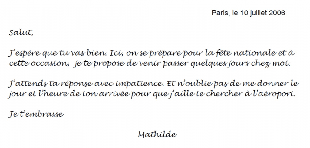 Vous avez reçu cette lettre. Vous répondez à Mathilde : vous la remerciez et vous acceptez son invitation. Vous lui parlez de ce que vous aimeriez faire en France pendant ce séjour. Vous lui indiquez le jour, l’heure et le lieu de votre arrivée. (60 à 80 mots)