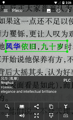 J’avoue … au début je n’y croyais pas mais après quelques utilisations j’ai été bluffé. Ce n’est pas infaillible mais ça fonctionne très souvent. Il vous suffit d’activer la fonction, d’autoriser l’application à utiliser la caméra. Essayer de faire en sorte que le texte soit écrit assez gros en noir sur fond blanc (type article de journal). Il ne vous reste plus qu’à lire le pinyin et la traduction des caractères reconnus.