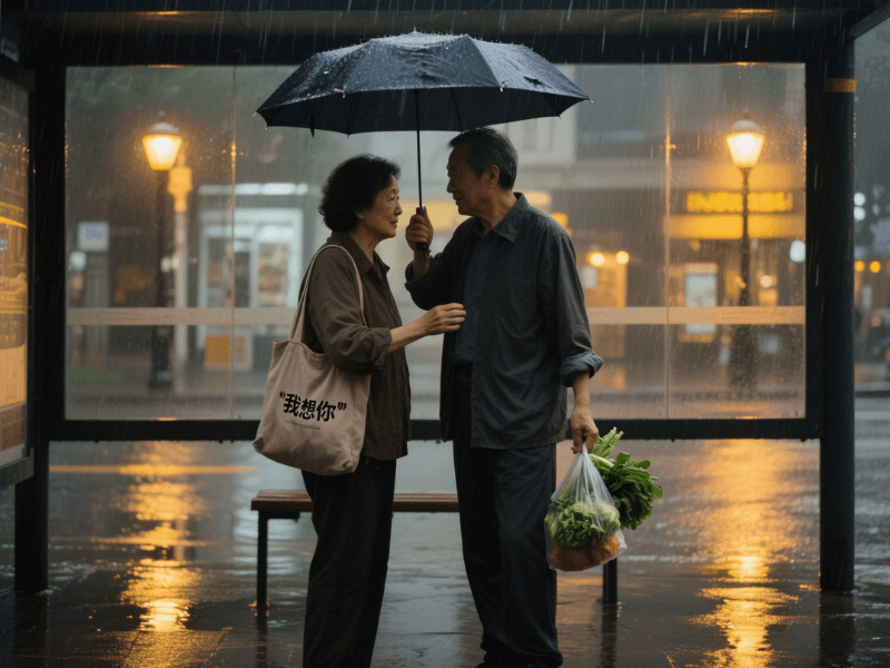 Image poétique : deux parapluies qui avancent côte à côte sous une pluie fine, et une phrase qui sort comme un souffle : 有你真好.
