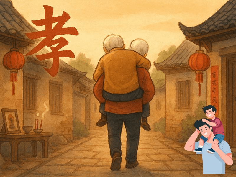 D’ailleurs, regardez bien le caractère 孝. En haut, c’est le vieil homme (老), et en bas, c’est l’enfant (子). Comme si le message était clair : l’enfant porte le parent sur son dos. Pas juste physiquement, mais aussi moralement, financièrement, affectivement. C’est beau, non ? Mais c’est aussi une grande responsabilité.