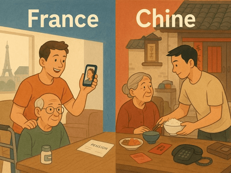 En Chine, c’est une autre histoire. Ici, la solidarité passe d’abord par la famille. Pas d’État providence aussi développé, surtout pour les générations nées avant les réformes. Et donc, ce sont les enfants — souvent un seul enfant — qui doivent assurer.