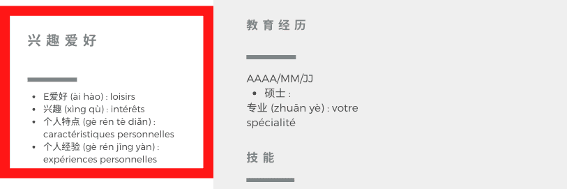 Cette partie peut sembler anodine mais c’est celle qui va permettre de vous connecter au recruteur. En effet, cette section du CV Chinois est assez personnelle. Vous allez pouvoir détailler ce qui vous plaît, essayer de détailler un maximum les loisirs qui vous mettent en valeur. Jouer d’un instrument de musique est très bien vu en Chine, le sport et la culture sont également valorisé. Si vous vous intéressez à la calligraphie ou à des spécificités de la culture chinoise n’hésitez pas à le mettre. Vous marquerez sûrement des points.
