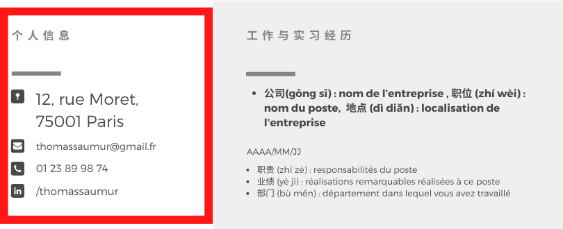 Dans cette partie, il faut que vous communiquiez les informations qui permettront à votre futur employeur de vous contacter. N’oubliez pas de noter 个人信息 pour que le recruteur identifie facilement la partie en question.