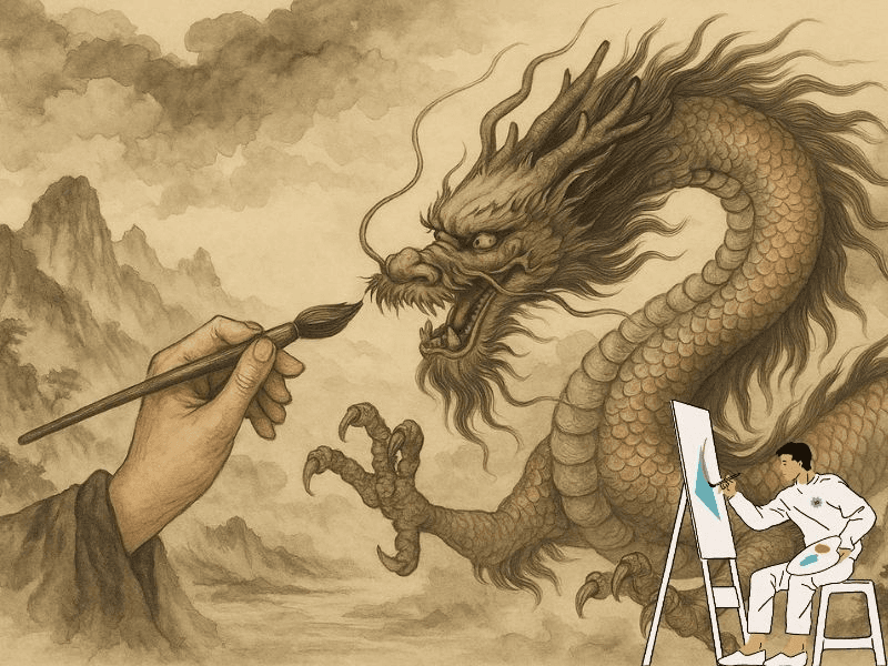 Ce chengyu vient d’une légende : un peintre talentueux dessinait des dragons majestueux, mais sans jamais peindre les yeux. Pourquoi ? Parce qu’une fois les pupilles ajoutées, les dragons prenaient vie et s’envolaient. Aujourd’hui, l’expression signifie : ajouter le détail final qui donne vie à l’ensemble. L’équivalent chinois du « coup de génie ».