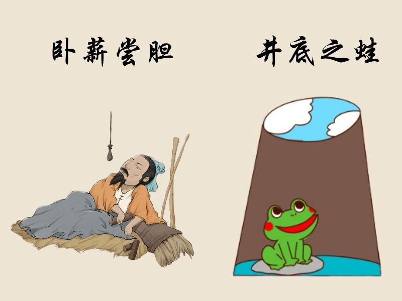 Ce chengyu raconte la revanche du roi Goujian du royaume de Yue. Après avoir été vaincu et humilié, il vécut des années dans l’inconfort volontaire pour se rappeler son humiliation. Il finit par reprendre le dessus et vaincre son rival. Aujourd’hui, il symbolise la capacité à supporter les difficultés pour mieux rebondir.