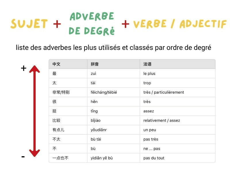 Les adverbes de degré comme « très » (很, hěn), « extrêmement » (非常, fēicháng) et « assez » (挺, tǐng) se placent avant l’adjectif ou le verbe qu’ils modifient.